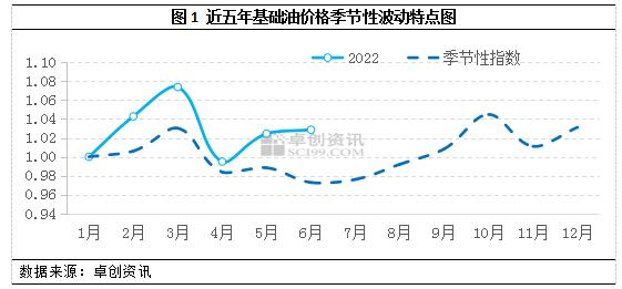 022年二季度,国内基础油市场价格走势逐渐脱离历史季节性规律。在传统基础油市场运行规律中,一般3-4月份为第一个消费旺季,5月份处于一个旺转淡的过渡期,6-7月份则进入传统消费淡季,而在这不同的阶段中,价格表现亦有所不同。图1为基础油价格的季节性波动特点,图中的两条线分别为2022年与历史(过去五年)的季节性指数,我们先从历史季节性指数来看,往年的4-8月份,历史季节指数数值一般低于1,在这个阶段,基础油市场整体处于下跌趋势,4-5月下跌速度较为缓慢;5-6月份,下跌速度有所加快。而从2022年的季节指数来看,4月份的季节指数低于1,基础油市场出现轻微下滑,整体符合季节性波动特点,但从5月份开始,在供需两弱的背景下,基础油市场价格却不断延续高位上行走势,也就是说当前的基础油市场已逐渐脱离历史季节性规律。